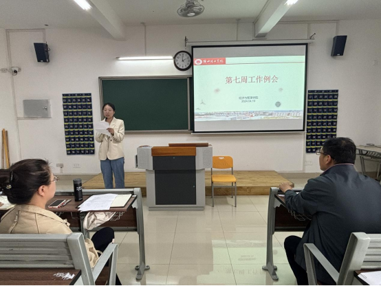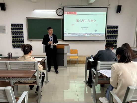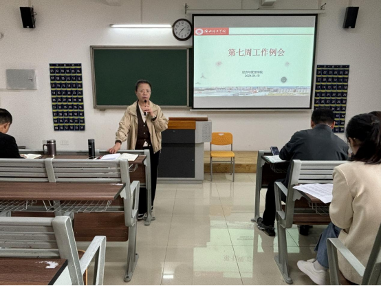 2024年4月10日下午,v站体育官网在一教213召开v站体育官网第七周工作例会,院长吴玲主持会议,副院长秦品德、院长助理张珊以及全体教师参会。