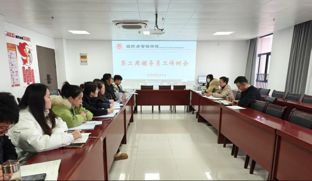 2025年3月4日,v站体育官网在行政楼725会议室召开了本学期开学第二周的学生管理工作例会。学院书记助理员禹辛、团总支书记王绎程及全体辅导员参会,会议由院长吴玲主持。