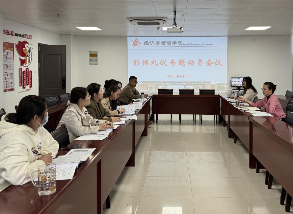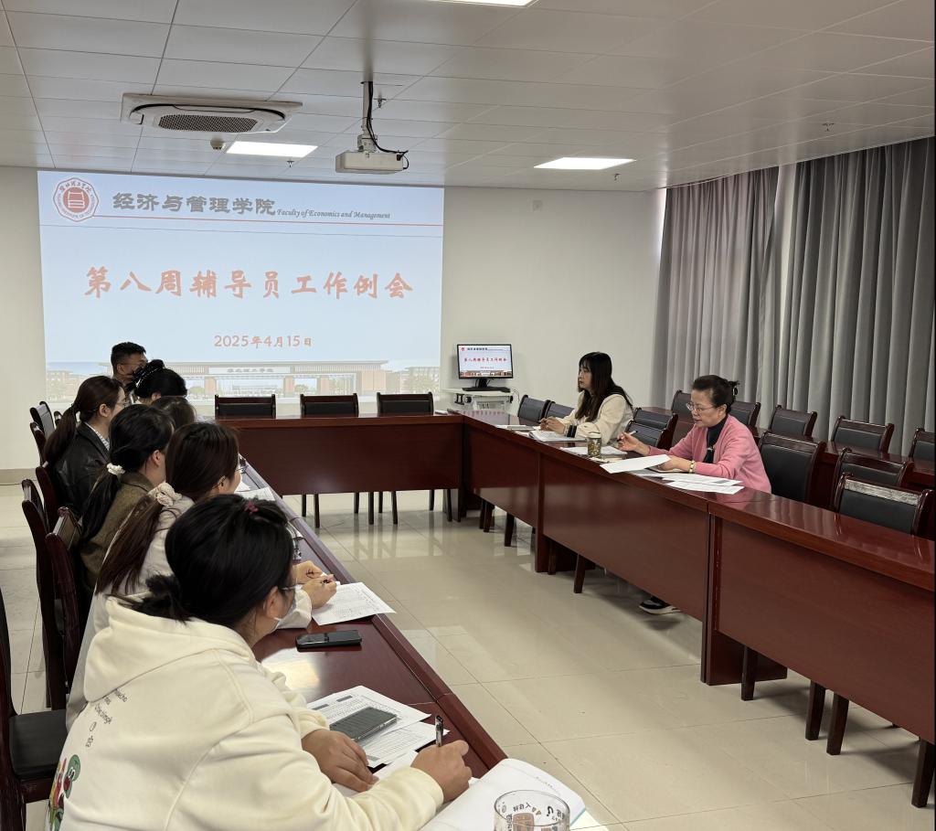 2025年4月15日,v站体育官网在行政楼725会议室召开本学期第八周学生管理工作例会暨形体礼仪专题动员会议,学院书记助理员禹辛及全体辅导员参会,会议由院长吴玲主持。