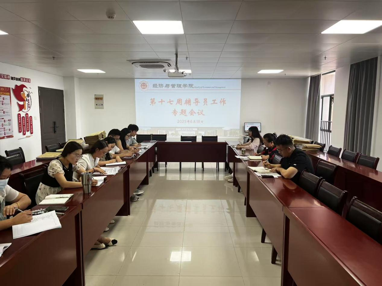 2025年6月17日,v站体育官网在行政楼725会议室召开本学期第十七周学生管理工作例会暨暑期“三下乡”社会实践专题动员会议,学院书记助理员禹辛、团总支书记王绎程及全体辅导员参会,会议由院长吴玲主持。