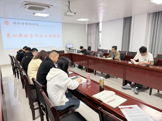 2025 年 9 月24日上午,v站体育官网在行政楼725 会议室召开第四周教学行政工作例会。院长吴玲主持会议,院长助理张珊、叶赵强,教学秘书李健,各教研室主任及相关行政人员参会。
