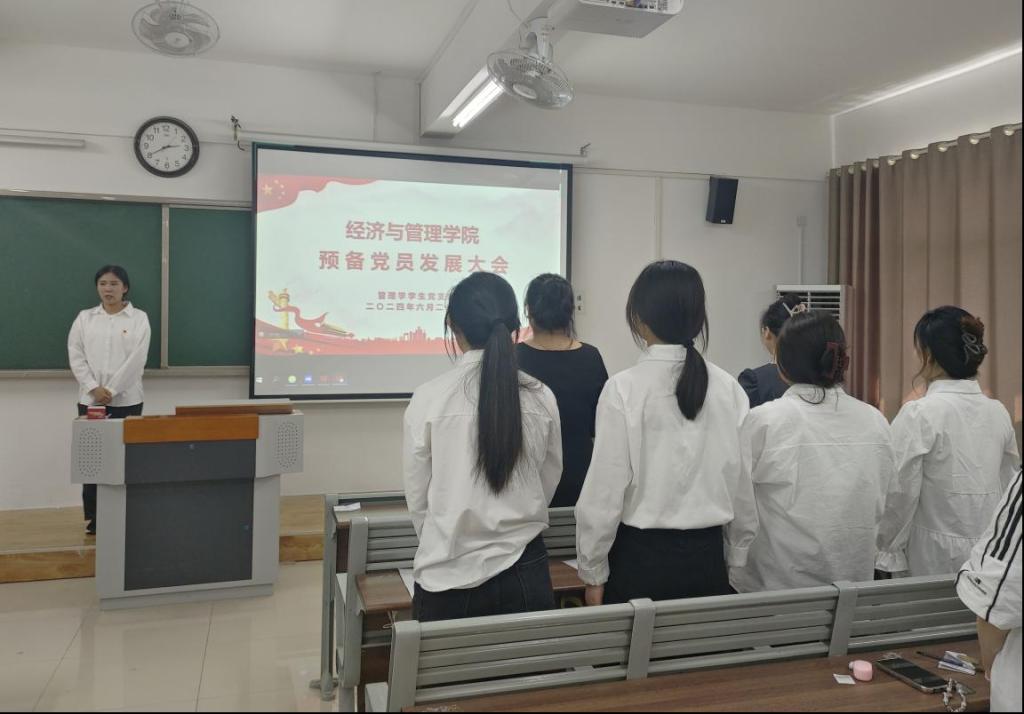 为深入贯彻党支部发展党员计划,加强党员队伍建设,v站体育官网经济学、管理学学生支部于6月26日在二教422、423教室隆重召开预备党员接收大会。此次会议由支部委员丁阳、王晓勉主持,经济学、管理学学生支部全体党员共襄盛举。