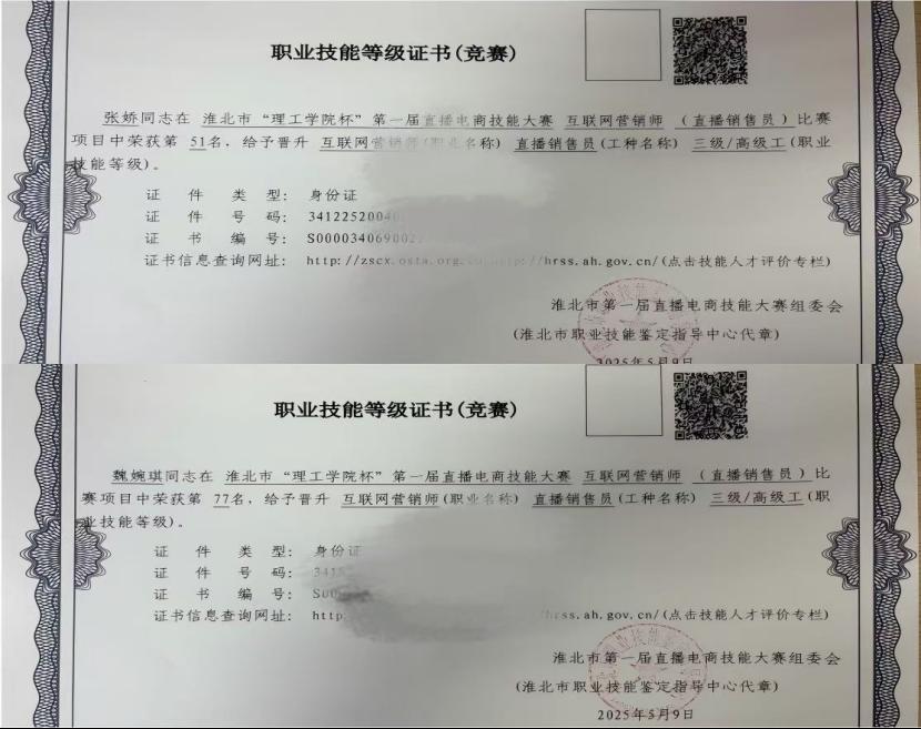 近日,经淮北市职业技能鉴定指导中心严格考核与认定,v站体育官网徐畅等165名师生首次批量成功获得“互联网营销师直播销售员三级/高级工”证书,这是对他们专业技能水平的高度认可,也彰显了v站体育官网在新兴职业技能人才培养领域的卓越成就。