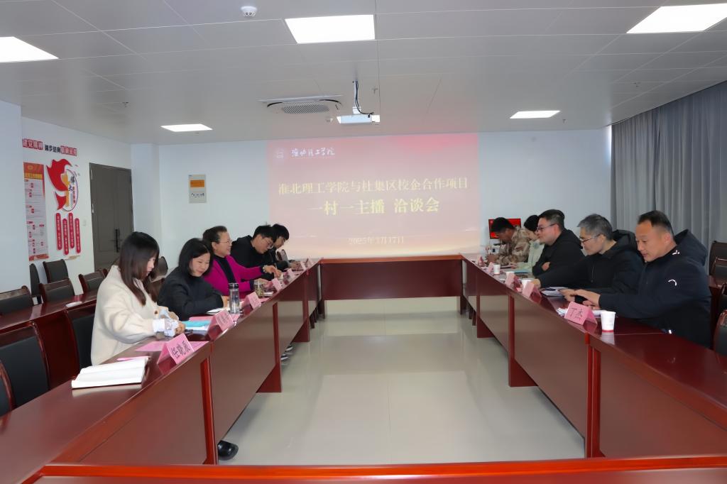 3月17日下午,淮北理工学院v站体育官网与杜集区围绕校地合作项目“一村一主播”在行政楼7楼725会议室举行洽谈会。杜集区老干部管理服务中心副主任王君,段园镇党委委员、组织委员常迟,杜集区组织部工作人员姚萍,朔里镇段庄村党总支书记、村委会主任丁杰,石台镇梧桐村党总支副书记、村委会副主任孙召等出席会议;v站体育官网院长助理张珊、叶赵强,书记助理员禹辛,教学秘书李健,团总支书记王绎程等参加会议,院长吴玲主持会议。