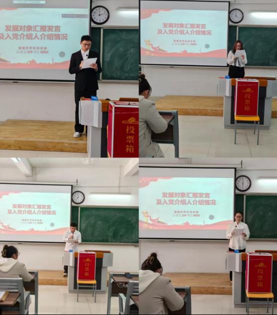 在经济学学生党支部会场,支部书记员禹辛、青年委员王绎程、辅导员郑凡、李茹参会,院党总支组织员王胜男列席指导。赵杭江等7名发展对象依次宣读《入党志愿书》,结合个人思想认识、现实表现及入党动机等方面向党组织作汇报,表达了加入中国共产党的坚定意愿。入党介绍人分别介绍了发展对象的培养考察情况,与会党员进行充分讨论后,通过无记名投票一致同意接收7名同志为预备党员。