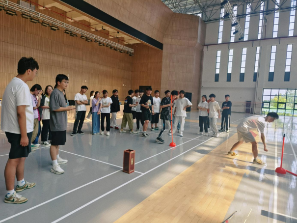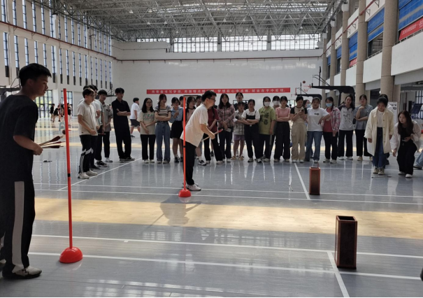 活动初始,由石园园将参赛学生6人一组、分成十组,并讲解活动规则。随后,开始第一项活动——趣味投壶。让各组员先转圈后进行投壶并交替进行,用时最短的小组获胜。本项活动培养了大学生团结合作精神,提高了大学生的心理素质。
