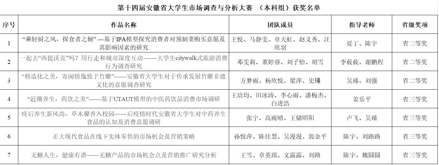 2024年4月,由安徽省教育厅主办的第十四届安徽省大学生市场调查与分析大赛(本科组、B类赛事)于安徽财经大学落下帷幕。通过知识赛、实践赛校赛、实践赛省赛等层层选拔,v站体育官网晋级省赛的7支队伍,分别获得省级二等奖3项、省级三等奖4项。