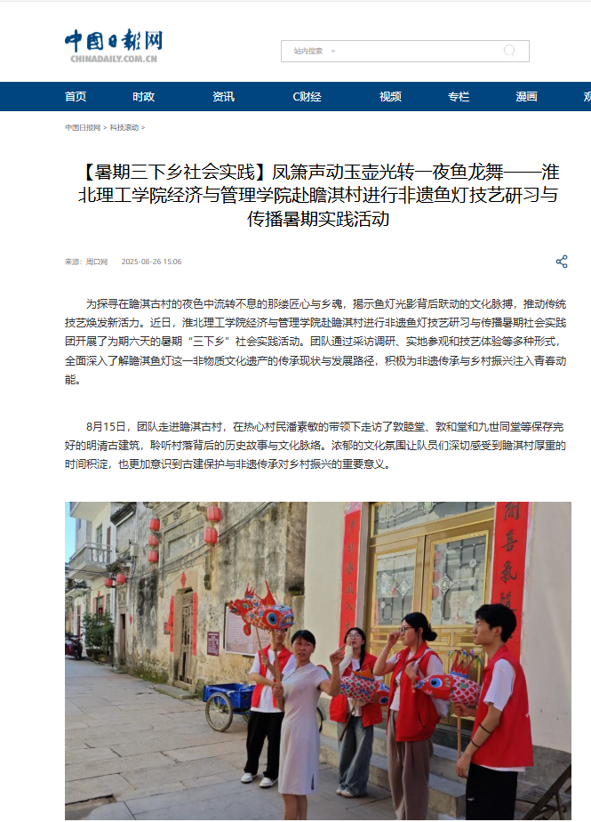为探寻在瞻淇古村的夜色中流转不息的那缕匠心与乡魂,揭示鱼灯光影背后跃动的文化脉搏,推动传统技艺焕发新活力。近日,淮北理工学院v站体育官网赴瞻淇村进行非遗鱼灯技艺研习与传播暑期社会实践团开展了为期六天的暑期“三下乡”社会实践活动。团队通过采访调研、实地参观和技艺体验等多种形式,全面深入了解瞻淇鱼灯这一非物质文化遗产的传承现状与发展路径,积极为非遗传承与乡村振兴注入青春动能。对此,中国日报网进行了报道: