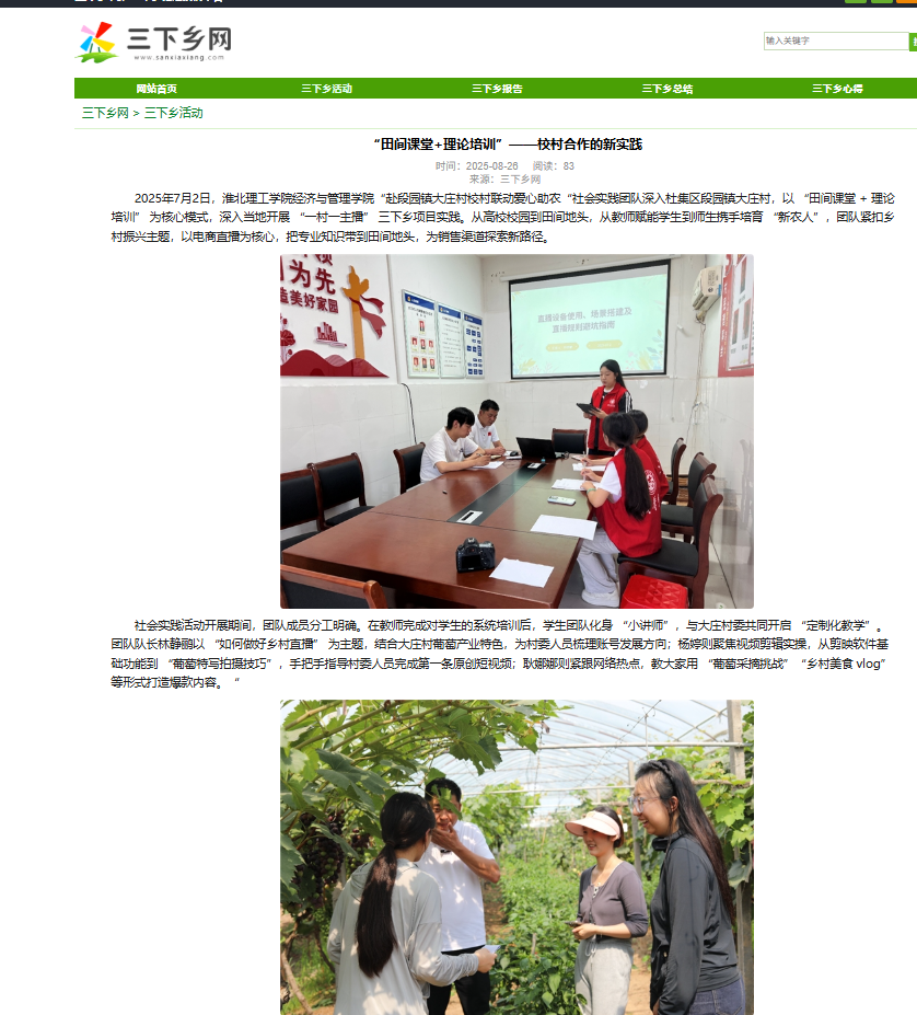 2025年7月2日,淮北理工学院v站体育官网“赴段园镇大庄村校村联动爱心助农“社会实践团队深入杜集区段园镇大庄村,以 “田间课堂 + 理论培训” 为核心模式,深入当地开展 “一村一主播” 三下乡项目实践。从高校校园到田间地头,从教师赋能学生到师生携手培育 “新农人”,团队紧扣乡村振兴主题,以电商直播为核心,把专业知识带到田间地头,为销售渠道探索新路径。对此,三下乡网进行了报道:
